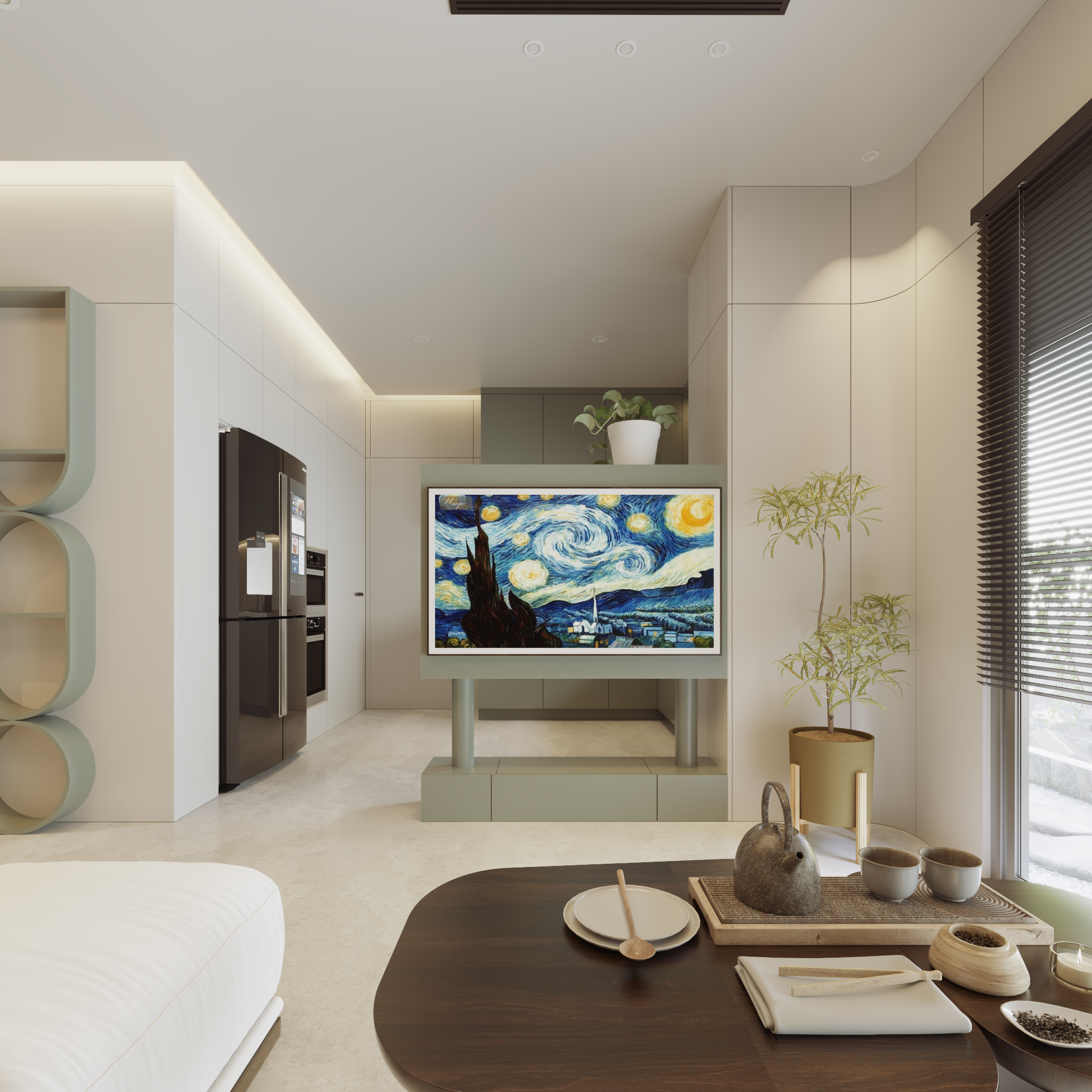 Thiết kế căn hộ 80m2 tại Vinhome Grand Park tập trung vào sự kết hợp giữa tính ứng dụng cao của phong cách Modern và sự mềm mại, thư thái của đường cong.